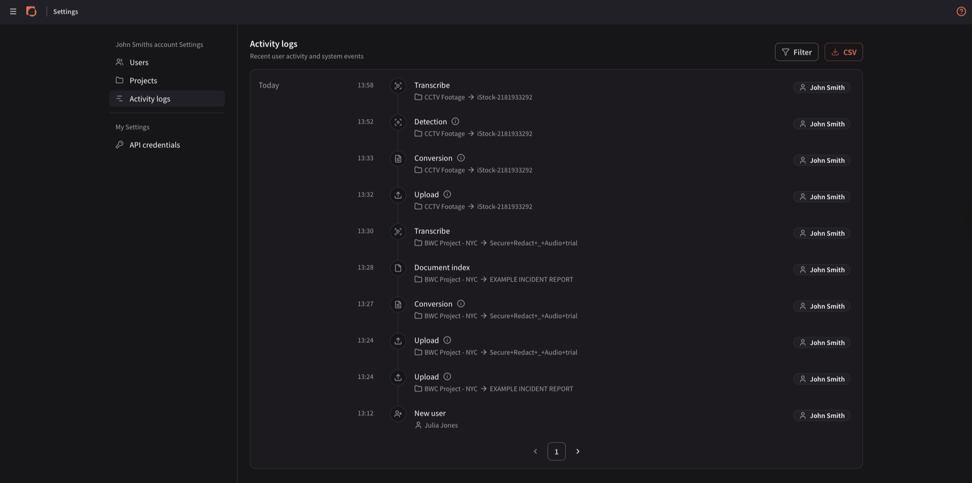 Here are all your users’ recent activity. Use the Filter (top right) to filter by Project, Users, Activity types and/or Date range. Any filters selected will be applied when you download the CSV.