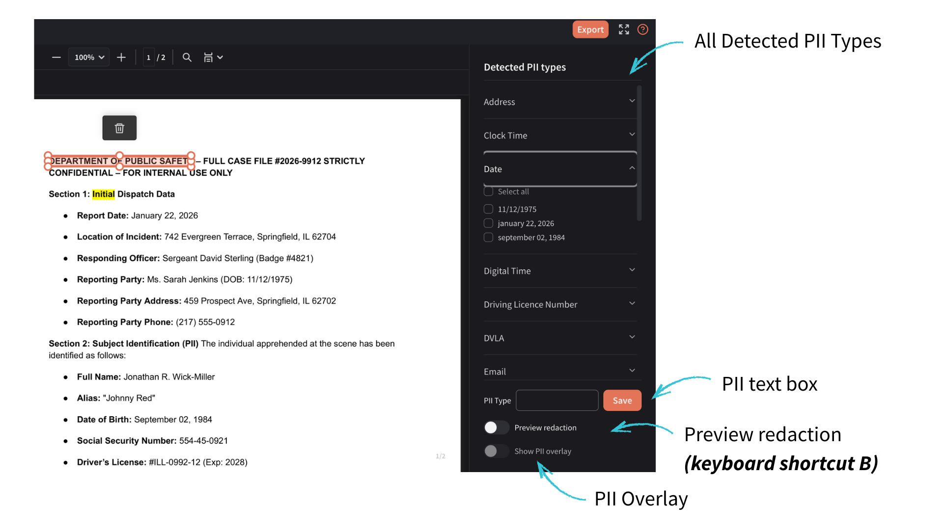 Show PII overlay = this will become clickable when Blur Preview is on. This overlays the PII type (or your added PII type) on the black-box redaction.