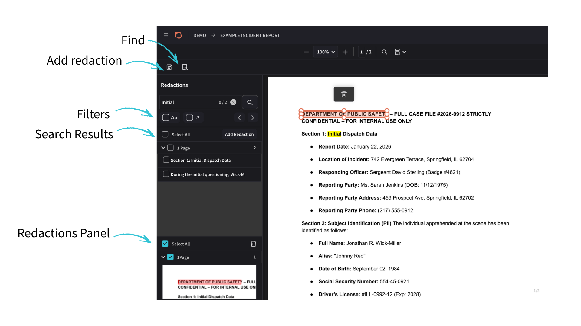 N.B.: Redaction boxes are visual indicators only - in the final PDF, Secure Redact permanently scrubs the underlying data rather than just layering a box over it, making the information completely unrecoverable.